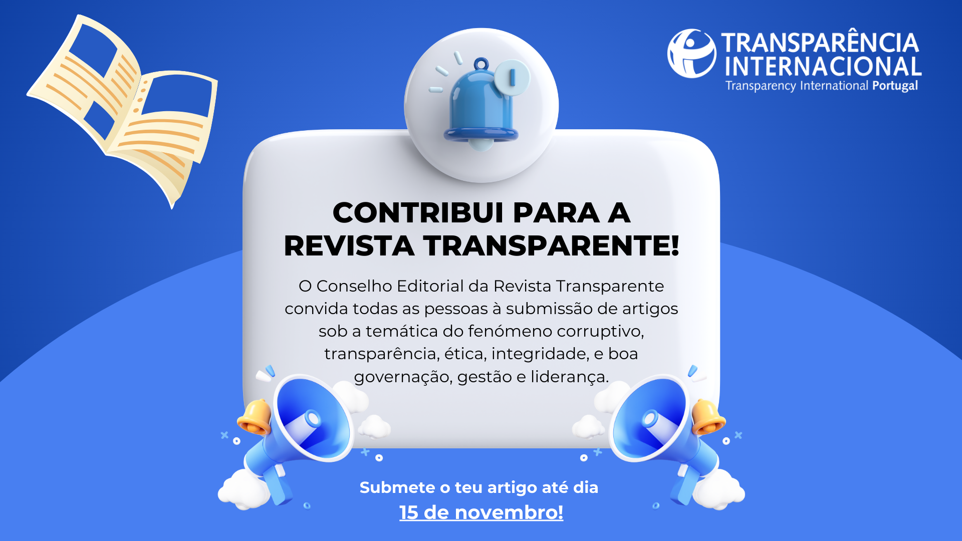 O Conselho Editorial da “Revista Transparente” – publicação digital, com periodicidade anual, da Transparência Internacional Portugal – convida todas as pessoas à submissão de artigos e recensões de obras publicadas sob a temática do fenómeno corruptivo, transparência, ética, integridade, e boa governação, gestão e liderança.