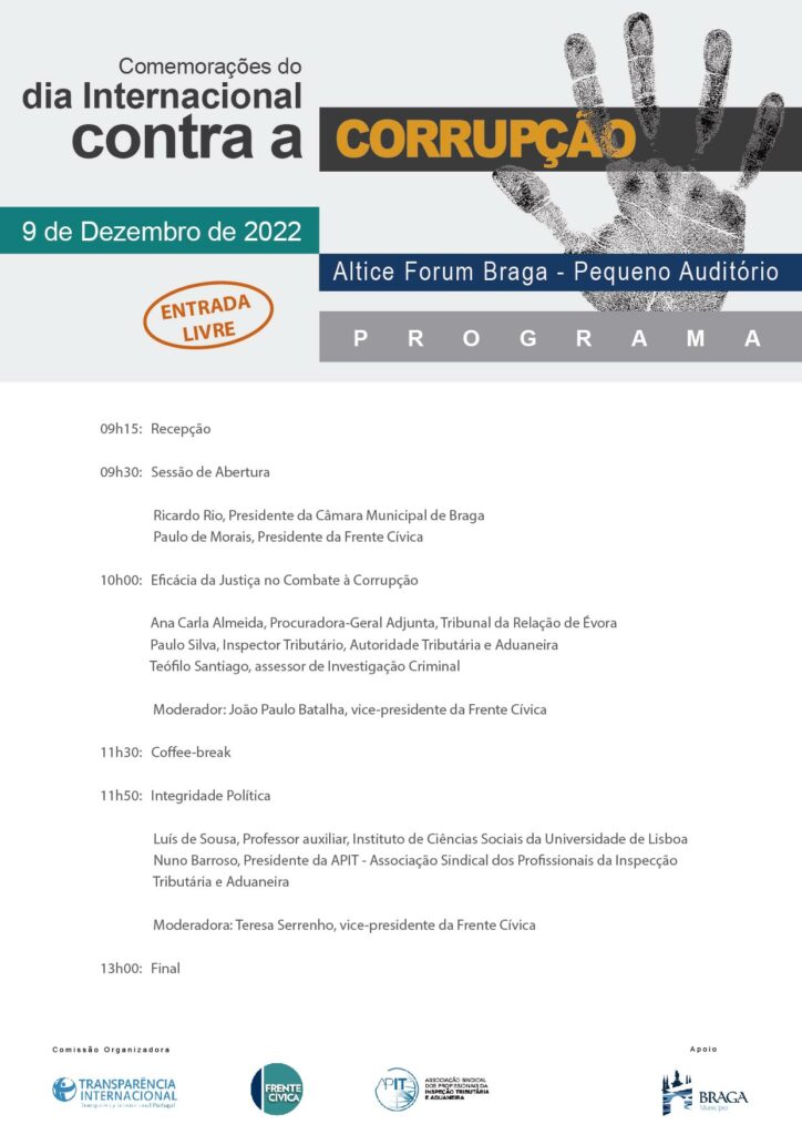 No dia 9 de dezembro de 2022 vamos comemorar o Dia Internacional Contra a Corrupção, com a Conferência organizada pela Associação Frente Cívica. Esta conferência tem o apoio da Transparência Internacional Portugal e terá lugar no Pequeno Auditório do Altice Forum Braga, entre as 9h15 e as 13h00. A entrada é livre.