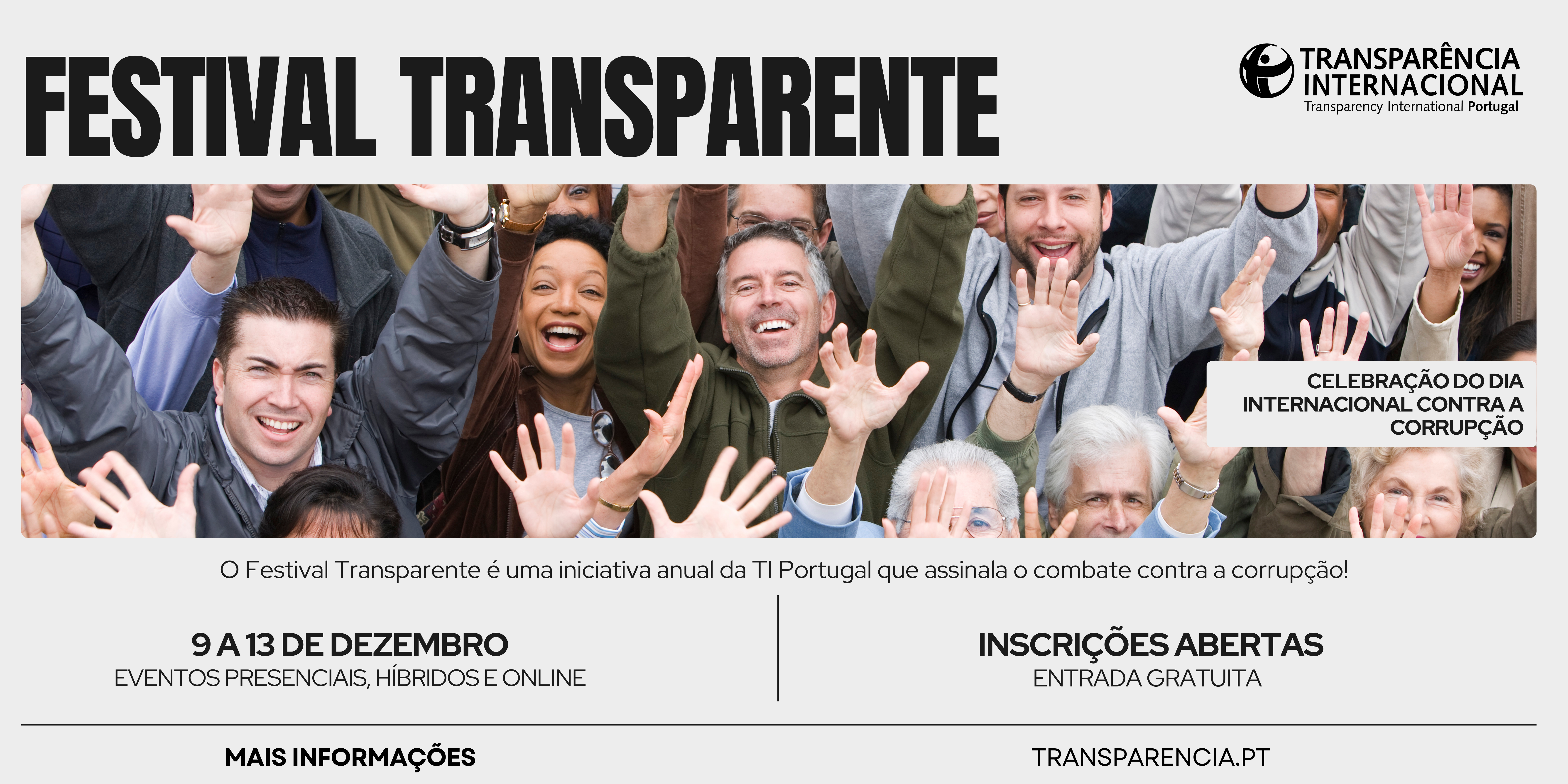 Como habitualmente, a TI Portugal organiza – de 9 a 13 de dezembro de 2024 – uma nova edição do Festival Transparente, juntando-se assim aos mais de 100 capítulos da Transparency International, coligação mundial de ONG anticorrupção, e aos milhares de organizações e movimentos da sociedade civil espalhados pelo mundo, na celebração do combate à corrupção como instrumento de capacitação cívica e de proteção dos Direitos Humanos.