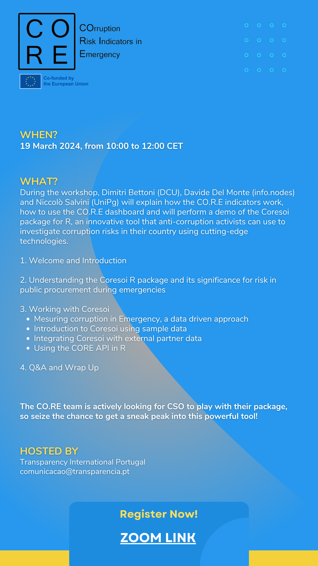 Este workshop inserido no Projeto CO.R.E. (COrruption Risk Indicators in Emergency), do qual a TI Portugal faz parte, destina-se a Ativistas Anticorrupção e Organizações da Sociedade Civil e irá fornecer uma introdução de fácil utilização para principiantes sobre como analisar os riscos de corrupção nos contratos públicos através de Big Data.