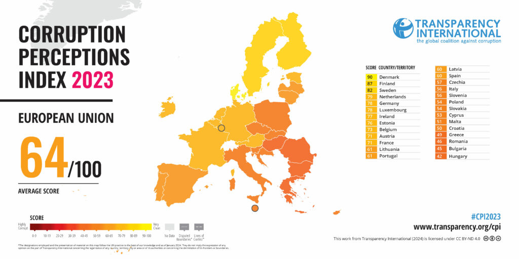 O Índice de Perceção da Corrupção 2023 evidencia que a maioria dos países fez poucos ou nenhuns progressos no combate à corrupção. A média global mantém-se inalterada (43), pelo décimo segundo ano consecutivo, com mais de dois terços dos países a registarem resultados inferiores a 50, o que indicia graves problemas de corrupção.