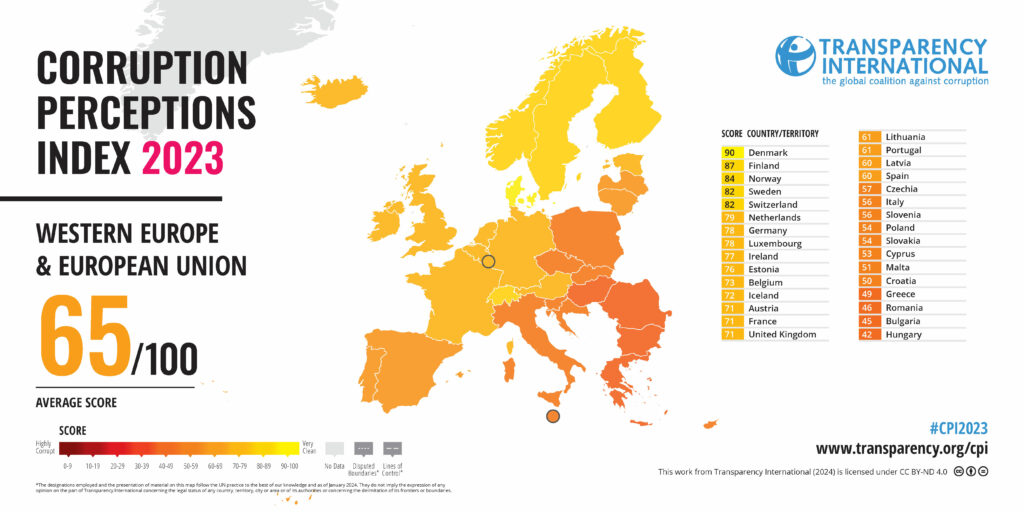 Quanto à região da Europa Ocidental e União Europeia (UE), a pontuação desceu de 66 para 65 pontos em 100. Apesar de continuar a ser a região do mundo com melhor pontuação, as medidas anticorrupção robustas continuam a ser prejudicadas pelo enfraquecimento das estruturas de controlo e supervisão e a erosão da integridade na política contribui para diminuir a confiança dos cidadãos na capacidade dos países europeus para enfrentarem os atuais desafios da região. Os dados revelam ainda que os esforços anticorrupção estagnaram ou regrediram em mais de três quartos dos países europeus e, desde 2012, apenas seis países melhoraram a sua pontuação, sendo que oito diminuíram.