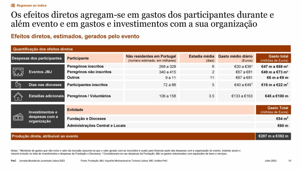 Apresentado no passado dia 5 de julho, o relatório tomou como referência um número de 600 a 750 mil participantes, e teve em conta os gastos de alojamento, alimentação, transportes e outros gastos dos participantes, além do investimento e gastos associados à organização do evento.