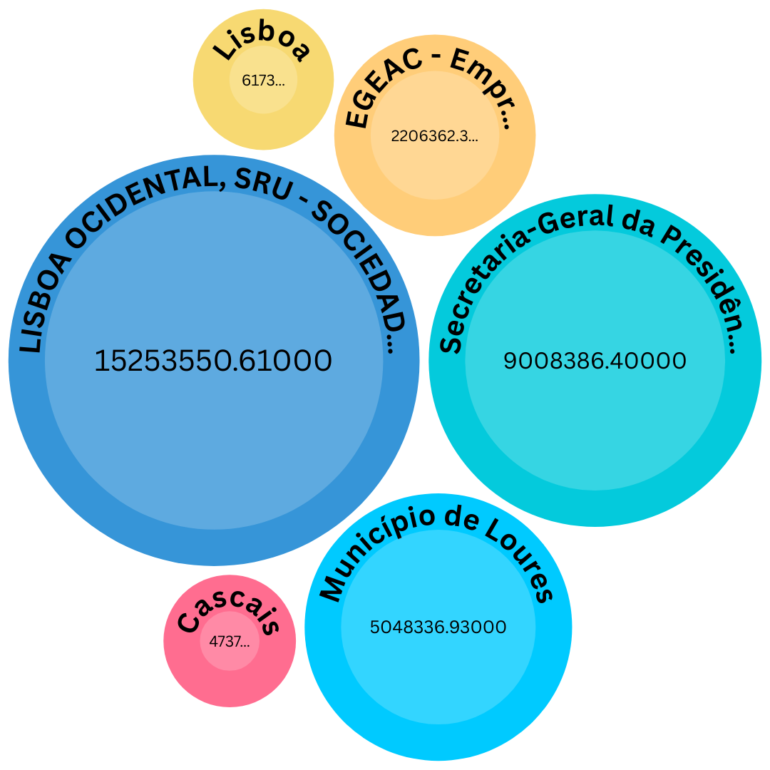 Mais de 95% dos 33 milhões de euros em contratos extraídos do Portal Base resultam de contratos celebrados por apenas quatro entidades: Lisboa Ocidental SRU – Sociedade de Reabilitação Urbana E.M., S.A, Secretaria-Geral da Presidência do Conselho de Ministros, Município de Loures, e EGEAC – Empresa de Gestão de Equipamentos e Animação Cultural, E.M., S.A
