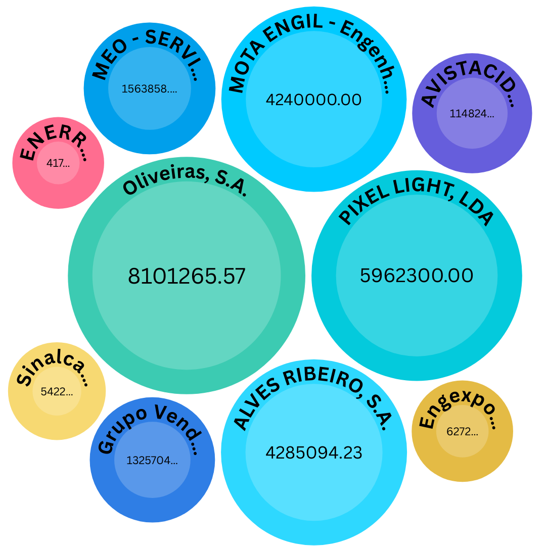 28 milhões (85%) dos 33 milhões de euros foram atribuídos às seguintes 10 empresas: Oliveiras, S.A.; PIXEL LIGHT Lda.; Alves Ribeiro, S.A.; MOTA ENGIL; MEO; Grupo Vendap; AVISTACIDADE; Engexpor; Sinalcabo e ENERRE. Mais de 23 milhões foram atribuídos apenas a 5 empresas: Oliveiras, S.A.; PIXEL LIGHT, Lda.; Alves Ribeiro, S.A.; MOTA ENGIL e MEO. Do top 10 de empresas contratadas (por preço contratual total), a Alves Ribeiro, S.A. e a MEO estão listadas no site da Fundação JMJ Lisboa 2023 como entidade parceira, e entidade parceira fundadora, respetivamente.