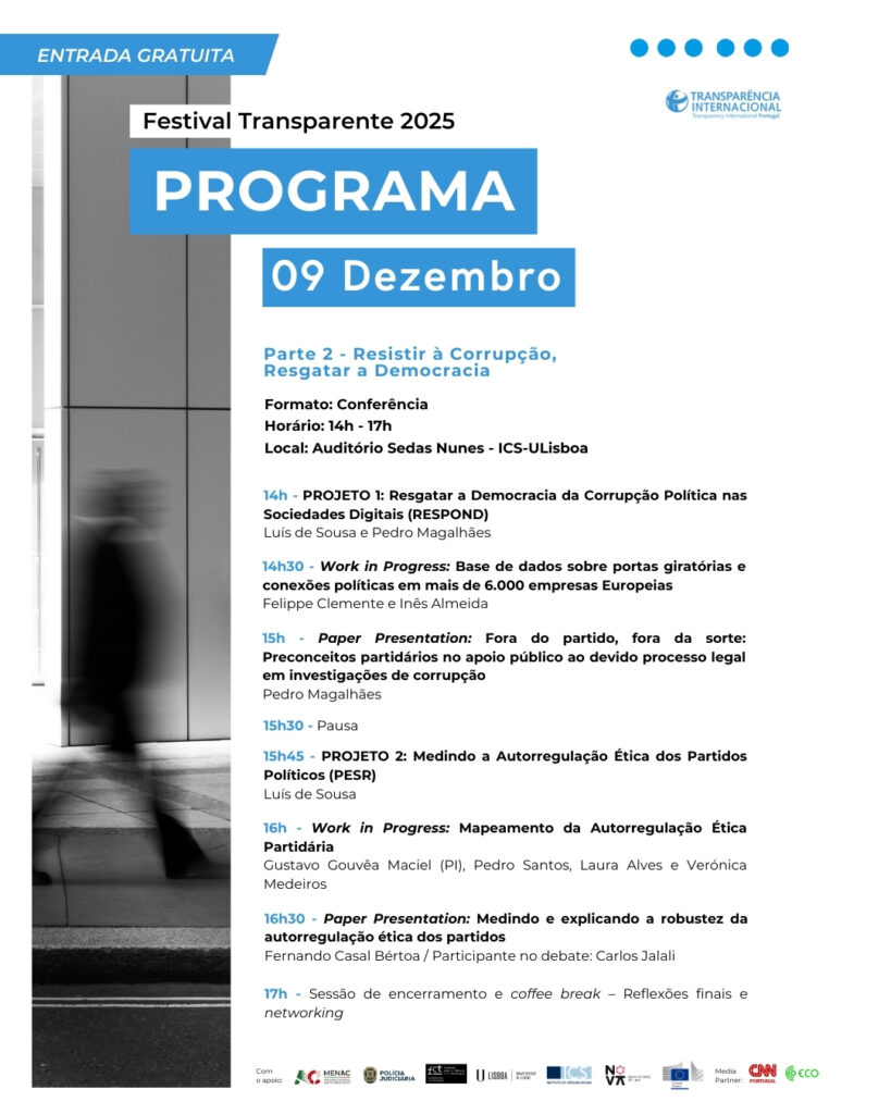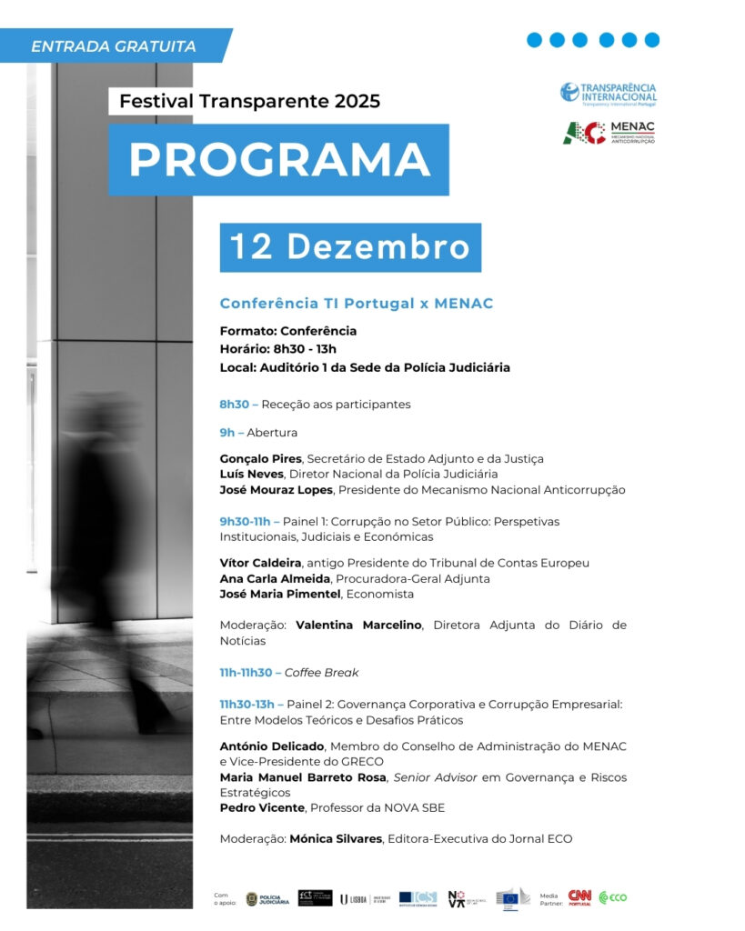 De 9 a 12 de dezembro, reunimos especialistas, académicos, jornalistas, decisores públicos e organizações parceiras para quatro dias de conferências, debates e tertúlias dedicados à integridade, à democracia e ao combate à corrupção.